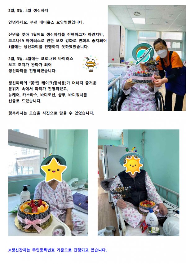 2023년 2월, 3월, 4월 생신잔치♡ 페이지 정보 작성자 메디홀스 작성일23-05-16 15:21 조회1,603회 댓글0건 관련링크 이전글 다음글 목록 본문 . 댓글목록 등록된 댓글이 없습니다. 이전글 다음글 목록