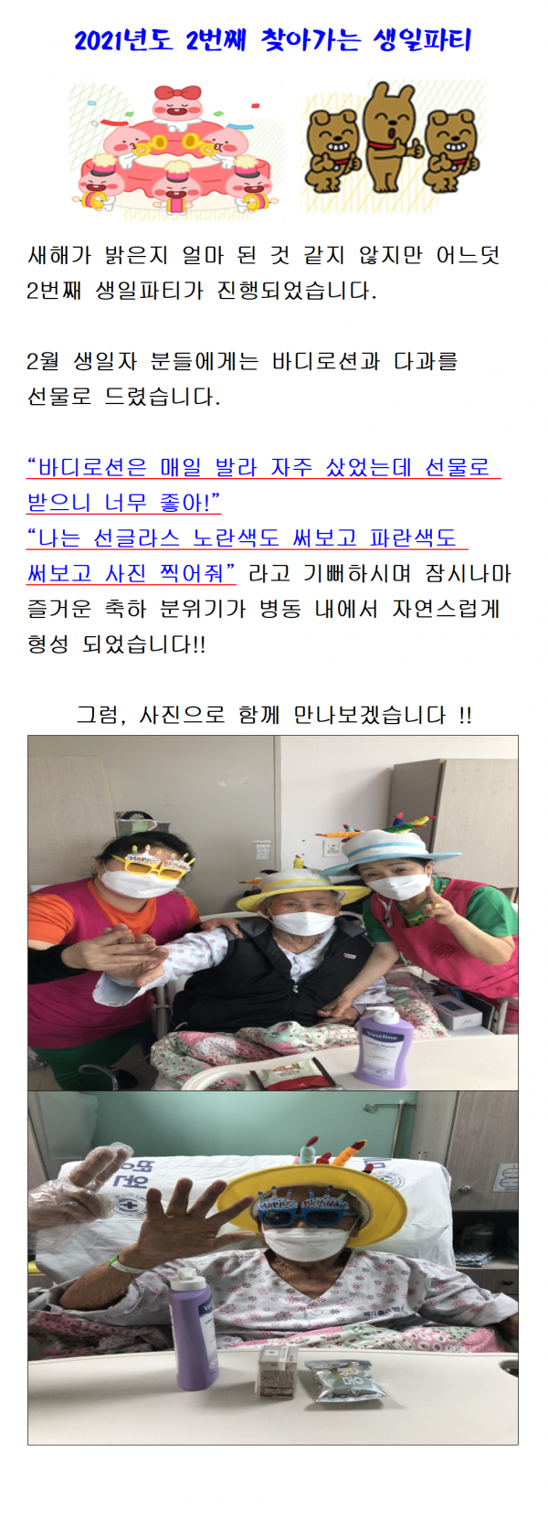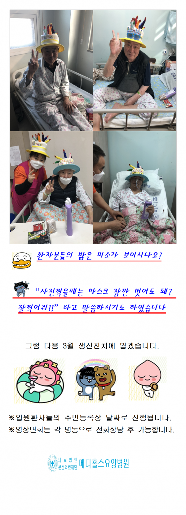 2021년 2월 생일파티 ^-^ !! 페이지 정보 작성자 메디홀스 작성일21-03-08 11:56 조회2,518회 댓글0건 관련링크 이전글 다음글 목록 본문 - 댓글목록 등록된 댓글이 없습니다. 이전글 다음글 목록
