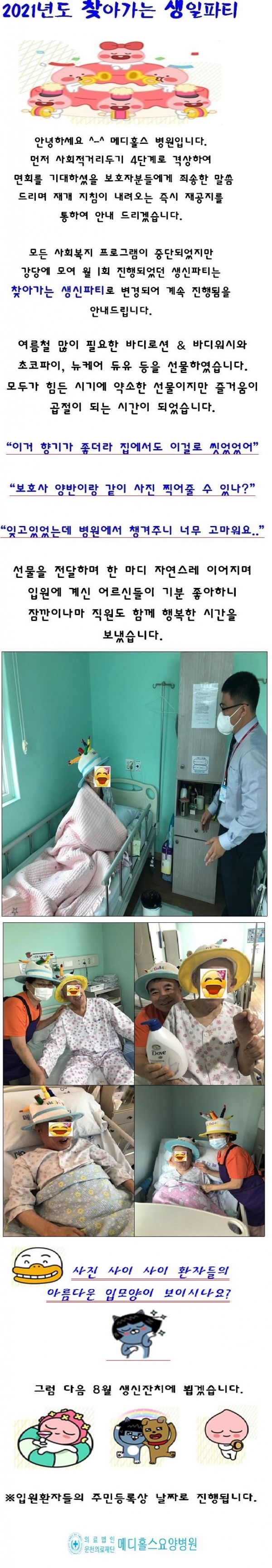 2021년 찾아가는 생일파티 6-7월 !! 페이지 정보 작성자 메디홀스 작성일21-08-03 17:53 조회2,511회 댓글0건 관련링크 이전글 다음글 목록 본문 - 댓글목록 등록된 댓글이 없습니다. 이전글 다음글 목록
