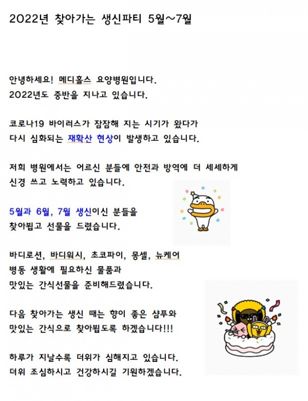 2022년 찾아가는 생신파티 5월~7월 페이지 정보 작성자 메디홀스 작성일22-08-05 17:08 조회1,837회 댓글0건 관련링크 이전글 다음글 목록 본문 - 댓글목록 등록된 댓글이 없습니다. 이전글 다음글 목록