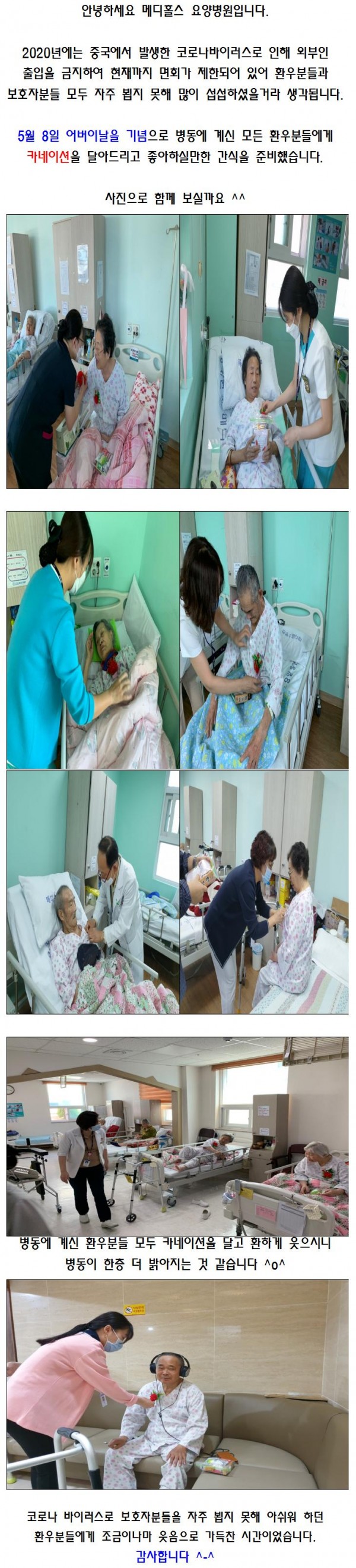 2020년 5월 어버이날 기념 ♥메디홀스♥ 페이지 정보 작성자 메디홀스 작성일20-05-08 15:20 조회2,936회 댓글0건 관련링크 이전글 다음글 목록 본문 - 댓글목록 등록된 댓글이 없습니다. 이전글 다음글 목록