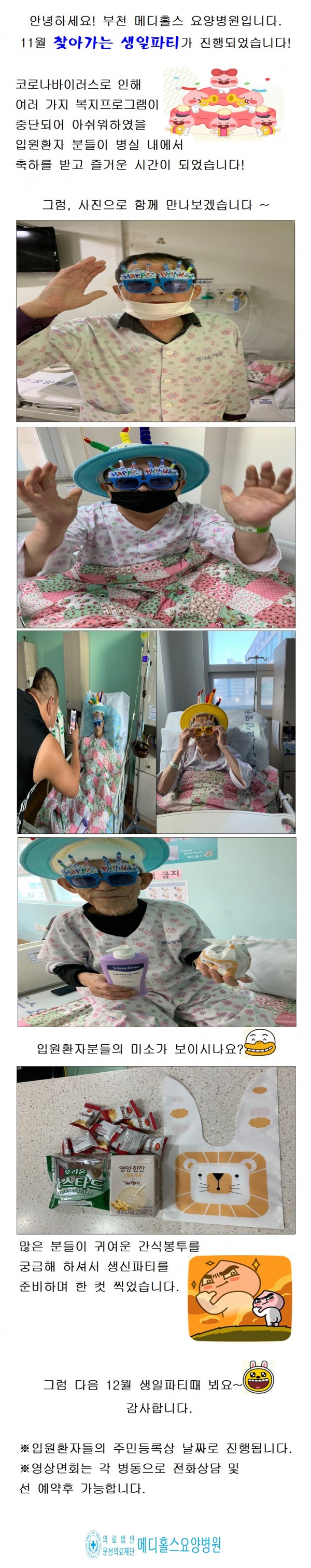 2020년 11월 찾아가는 생일파티 !! 페이지 정보 작성자 메디홀스 작성일20-12-04 10:59 조회2,626회 댓글0건 관련링크 이전글 다음글 목록 본문 - 댓글목록 등록된 댓글이 없습니다. 이전글 다음글 목록