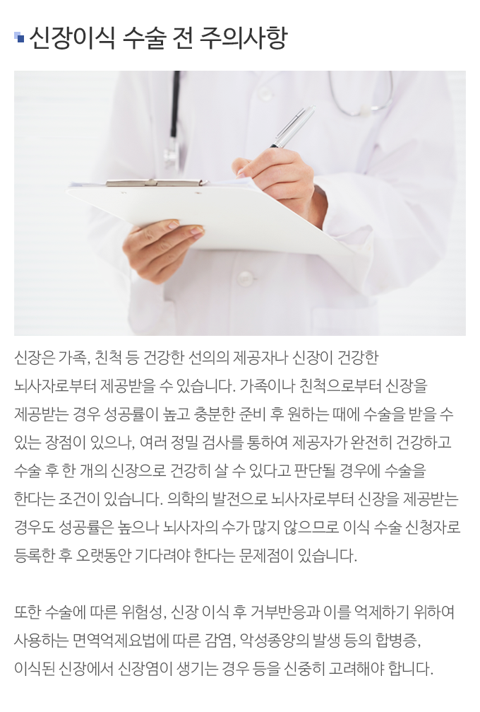 또한 수술에 따른 위험성, 신장 이식 후 거부반응과 이를 억제하기 위하여 사용하는 면역억제요법에 따른 감염, 악성종양의 발생 등의 합병증, 이식된 신장에서 신장염이 생기는 경우 등을 신중히 고려해야 합니다.