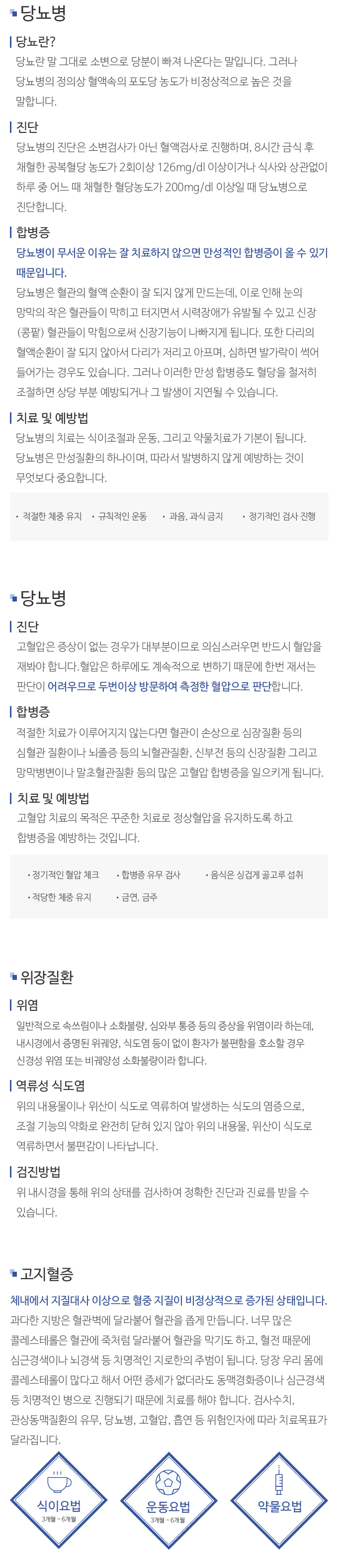 당뇨병의 치료는 식이조절과 운동, 그리고 약물치료가 기본이 됩니다. 당뇨병은 만성질환의 하나이며, 따라서 발병하지 않게 예방하는 것이 무엇보다 중요합니다.