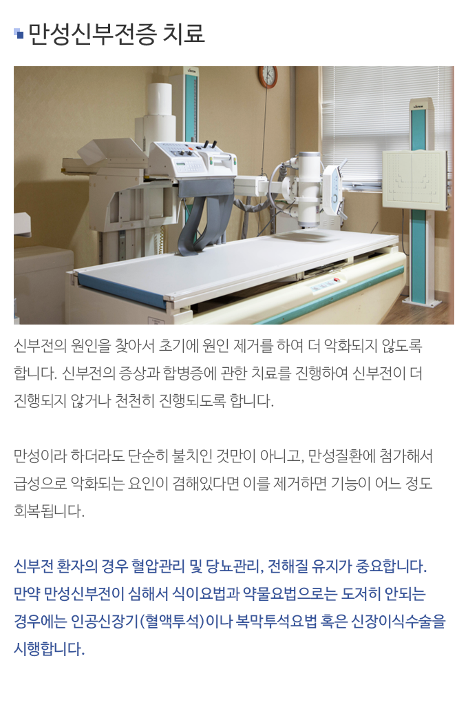 인공신장기(혈액투석)이나 복막투석요법 혹은 신장이식수술을 시행합니다.